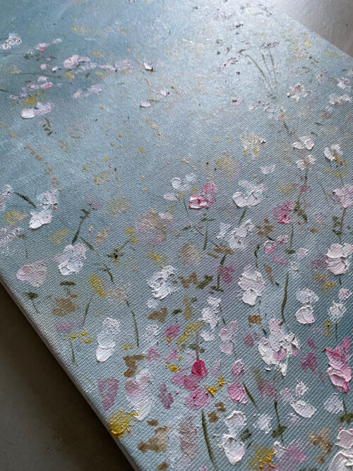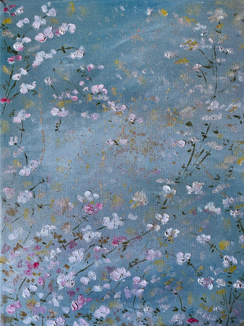 An Original Floral Oil Painting, with a steel blue background and small white florals on stretched canvas.